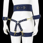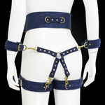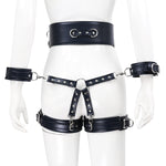Getting out into the world of bondage doesn't always mean going immediately to the steel and metallic restraints. This effective system includes belt, 4 cuffs , and a center connection piece. You can use these items to create an intricate hog-tie setup or use the cuffs to put your partner in a variety of bondage positions. The cuffs are made of a lightweight fabric and are highly adjustable.