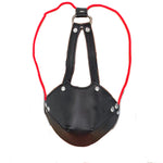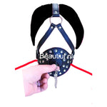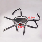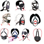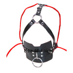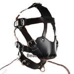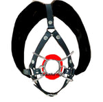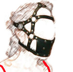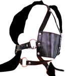 DESIGN:The muzzle gag consists of a series of straps that wrap around the head, as well as an attached collar.